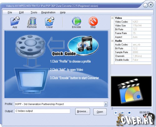 Opell Video Converter Pro - представляет собой мощный видео-конвертор все-в-одном, который поможет Вам преобразовать видео-файлы в WMV, RM, RMVB, AVI, MOV, FLV, MPEG-1, MPEG2, DivX, Xvid, 3GP, 3G2, MP4, H264, MPEG4 видео и MP2, MP3, WMA, WAV, RA, M4A, AAC, AC3, OGG аудио форматы. Поддерживает устройства: IPod, iPhone, Archos, PSP, PS3, Xbox360, Zune, Wii, Blackberry, мобильный телефон, MP4-плеер, плеер Creative Zen, HP IPAQ, Pocket PC, PDA и т.д. Конвертор очень прост в использовании, конвертирует быстро и с хорошим качеством.
