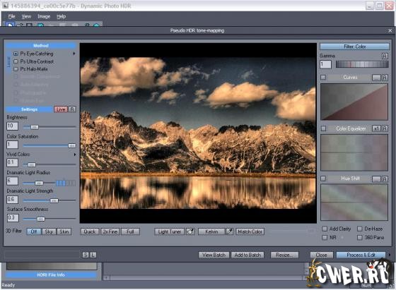 Основными ее особенностями являются простота использования, замечательные результаты и возможность создания HDR из одной фотографии. Последнее будет особенно полезно для владельцев фотокамер без функции автобрекетинга. Программа умеет работать с файлами формата RAW, полученными с разных цифровых камер. Так же позволяет корректировать изображения по ключевым точкам вручную и автоматически. Обладает такими возможностями, как автоматическая подгонка изображений, ручная корректировка по ключевым точкам, преобразование диапазона яркостей HDRI к диапазону яркостей, отображаемых монитором. В дополнение к этому Dynamic-PHOTO HDR поддерживает некоторые интересные эффекты - преобразование в черно-белые снимки или эффект Ортона. В программе также есть метод для улучшения изображения, работающий на основе разных тонов.