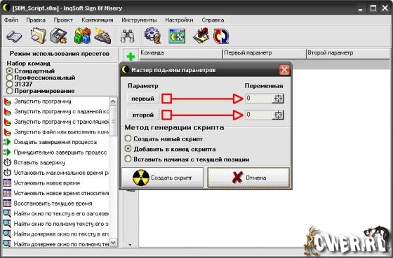 Все необходимые функции реализуются при помощи создаваемого пользователем скрипта, который в дальнейшем может быть откомпилирован в обычный исполняемый файл, предназначенный для работы в среде ОС Windows 9x\NT\ME\2000\XP. В отличие от существующих программ подобного рода, для работы скриптов установка Sign 0f Misery или каких-либо дополнительных библиотек на целевую машину не требуется - откомпилированный скрипт содержит внутри себя все, что необходимо для его нормальной работы. Также возможно сохранение скрипта в собственном формате InqSoft Sign 0f Misery, что позволяет хранить наиболее удачные скрипты в компактном формате, удобном для дальнейшего использования и усовершенствования а также обмениваться наиболее удачными скриптами с другими пользователями.