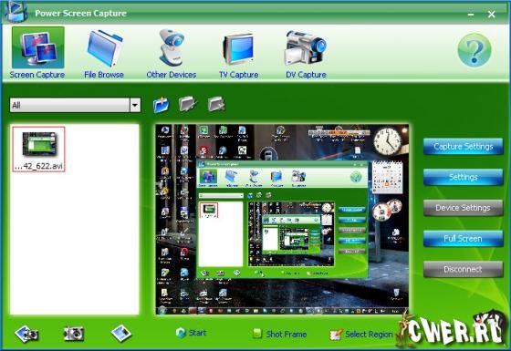 Power Screen Capture - мощная программа захвата всего что происходит на экране монитора с высоким качеством а так же захвата изображений с различных устройств типа DV видео и вэб-камер, TV тюнеров и прочих девайсов, в режиме реального времени.Возможна установка выходных параметром захваченного материла: видео и аудио кодеков, размер рамки и кадров в секунду и пр. Присутствует так же возможность нанесения водяных знаком и текстовых надписей.