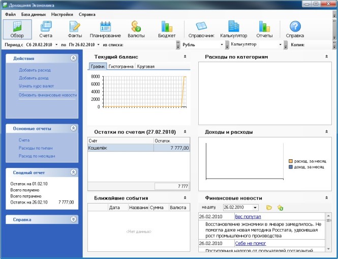 «Домашняя экономика» — это новая программа для управления личными финансами и планирования семейного бюджета. Теперь вы сможете точно знать, на что уходят ваши деньги и быстрее достигать значимых финансовых целей. Встроенный органайзер позволит планировать расходы и доходы, а система отчётов даст наглядное представление о движении денег. Программа включает уникальную функцию прогнозирования инфляции, благодаря которой становится возможным расчёт реальной доходности банковских вкладов и оценка эффективности кредитов. Вы сможете сравнивать различные виды вкладов или кредитов и выбирать наиболее выгодные. Программа позволяет также загружать курсы валют и просматривать доходы и расходы в любой выбранной валюте. Ориентироваться в экономической ситуации вам поможет ежедневная сводка самых важных финансовых новостей, а также большое количество практических рекомендаций от экспертов по управлению личными финансами. Интерфейс программы только на русском языке.