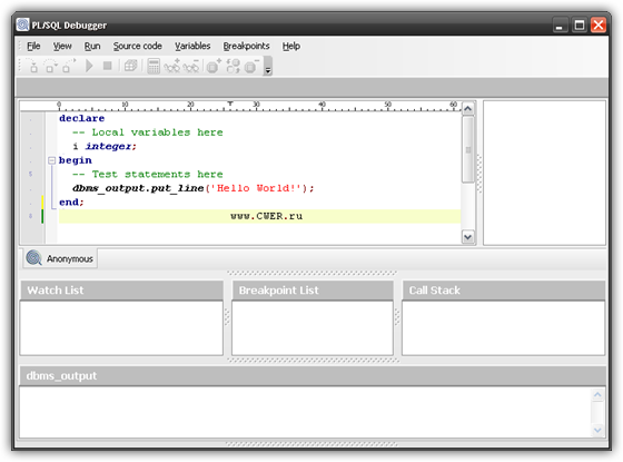 KeepTool PL/SQL Debugger gives you, the PL/SQL developer, all you need to test and debug code. You can set breakpoints and define watches for variables. Breakpoint lines are color-coded and can be removed or reset at will. In addition to the source display, there are separate windows that display watched variables, breakpoints and the call stack.PL/SQL Debugger has been designed with the same emphasis on usability as Hora. This ensures that both tools are closely integrated. Using Hora and the Debugger together, you will be on your way to creating to creating efficient PL/SQL code.