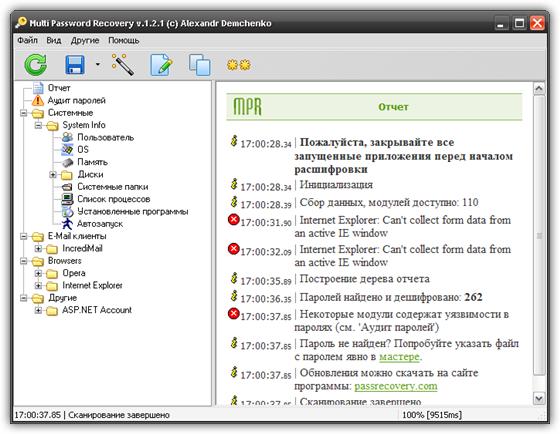 Multi Password Recovery - многофункциональное решение для Windows по расшифровке и тестировании паролей на стойкость. MPR автоматически находит и мгновенно расшифровывает пароли из более чем 100 популярных программ (FTP, E-mail клиенты, Интернет пейджеры, Браузеры и пр.), при этом, не требуя вмешательства пользователя. Кроме расшифровки, показывает пароли под здездочками, позволяет скопировать SAM файл, удалить сохраненные пароли, сгенерировать новый пароль, сохранить отчеты на жесткий диск.