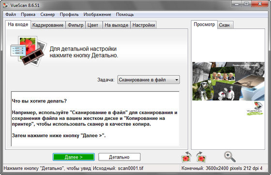 VueScan Pro - программа для работы со сканерами HP, Minolta, Nikon, Polaroid, Epson, Canon и другими. Может работать с внутренней глубиной цвета. VueScan поддерживает автоматическую и ручную настройку большинства параметров и пакетный режим сканирования. Поддерживается более 500 моделей сканеров с определенным перевесом в сторону слайд-сканеров — Nikon, Minolta, Polaroid, Microtek, Epson. Предусмотрено автоматическое удаление дефектов изображения за счет канала инфракрасного сканирования и многопроходное сканирование с последующим усреднением результата — для подавления собственных шумов сканера. Имеются фильтры подавления зерна, нерезкого маскирования и удаления паразитного оттенка оригинала. Есть средства ручной корректировки динамического диапазона и градационной характеристики (независимо по каналам R, G, B).
