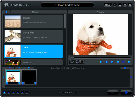 honestech™ Photo DVD™ 4.0 allows you to create spectacular photo slideshows using ready made themes or custom building your own to create that one of a kind memory. Using the latest in multi-media technology, you can add motion effects, transitions and text to your images, along with background music and voice over narration. When you are finished, upload your memories to YouTube, or burn them to CD or DVD to give to your friends and family.