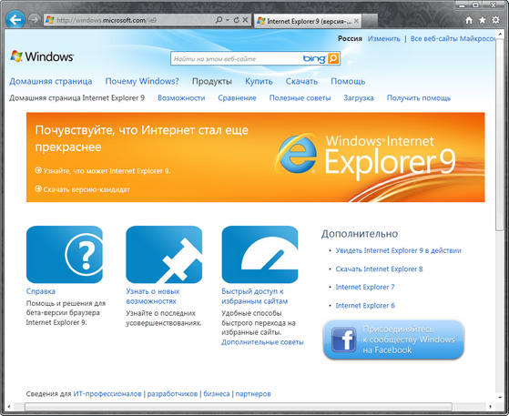 Улучшения браузера Internet Explorer касаются как видимых, так и невидимых компонентов. Браузер Internet Explorer 9 обладает упрощенным дизайном, более интуитивной навигацией, а также множеством новых функций, ускоряющих просмотр веб-страниц. Кроме того, для выполнения какого-либо действия вам понадобится открывать меньше диалоговых окон. Функции, подобные закрепленным сайтам, позволяют закрепить избранный веб-сайт на панели задач и получать к нему доступ одним щелчком мыши. Другие функции, например аппаратное ускорение, обеспечивают общее ускорение просмотра веб-страниц. При использовании браузера Internet Explorer 9 веб-сайты становятся больше похожи на ежедневно используемые на компьютерах программы.