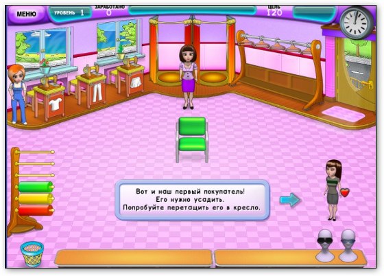 На каждом этапе игры вам необходимо заработать определенную сумму денег, иначе уровень придется переигрывать. Чтобы этого не произошло — следите за настроением посетителей. Не забывайте преподносить им небольшие подарки и угощать ароматным кофе, а также старайтесь выполнять несколько одинаковых действий подряд. Например, если заказать в мастерской сразу несколько предметов одежды одного цвета или кроя, то ваша выручка существенно увеличится.