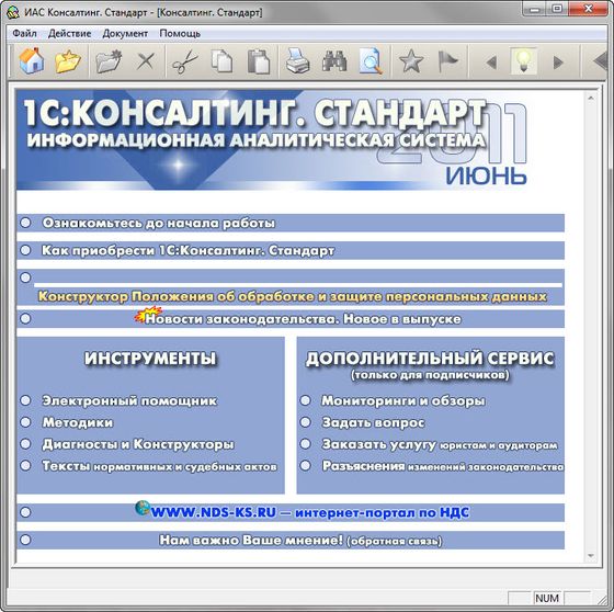 ИАС «1С:Консалтинг. Стандарт» - это сборник актуальных юридических, налоговых и бухгалтерских материалов, представленных в форме полезных практических инструментов. Уникальные инструменты ИАС «1С:Консалтинг. Стандарт» позволяют пользователям получать максимально индивидуализированную правовую помощь, отвечающую конкретным потребностям отдельно взятой организации или предпринимателя. Среди таких инструментов: