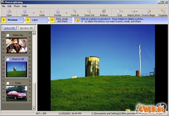 Photolightning - пакет программ для начинающих пользователей, позволяющий обрабатывать цифровые фотографии. Процессы загрузки, редактирования, печати и пересылки фотографий сведены буквально к нажатию одной-двух кнопок. Photolightning автоматически активируется при подключении к компьютеру цифрового фотоаппарата, автоматически загружает фото с носителя и (опять же автоматически) задает переносимым на жесткий диск файлам имена. Имеется опция быстрой отправки картинок по электронной почте, а также минимальные "способности" редактирования - можно подкорректировать яркость и резкость, изменить размер, а также распечатать фотографии.