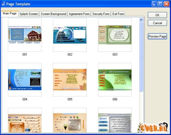 Main Page, Splash Screen, Screen Background, Agreement Form, Security Form, Exit Form and unlimited Sub Pages. Page Shadow, Page FadeIn and FadeOut, and many effects.