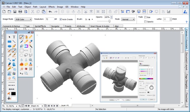 Canvas поставляется в комплекте с полным набором инструментов для редактирования растровых изображений. Создание, редактирование и увеличение растровых изображений производится с учётом отраслевых стандартов и специализированных методов, инструментов и фильтров. Canvas позволяет создавать композиции из изображений, заниматься дизайном, ретушировать фотографии, улучшать краски и цвета отсканированных изображений, создавать эффекты прозрачности и виньетки, состаривать фотографии и многое другое. - Установка точных размеров.
