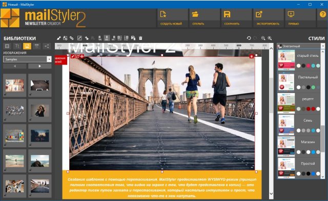 MailStyler – программа, которая позволяет вам создавать безупречные шаблоны электронных писем за несколько простых движений мыши. За несколько минут вы сможете создать удобочитаемый и готовый к использованию информационный бюллетень, дополнить его изображениями и контентом, и он всегда будет корректно отображаться в любом почтовом клиенте.