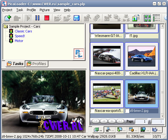 PicaLoader - специализированный менеджер загрузок для скачивания картинок. Умеет обрабатывать javascript ссылки, понимает нумерованные галереи, отбрасывает дубликаты, позволяет накладывать фильтры по адресу, формату, размерам, наличию анимации и т.д. В программу встроен вьюер картинок.