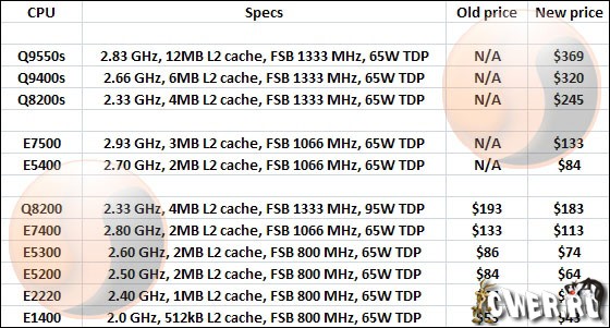 Теперь же к вышеизложенной информации добавились сведения о том, что одновременно с анонсом новых решений ведущий чипмейкер собирается ещё и "урезать" цены на некоторые из своих старых продуктов. Как сообщается, уценке подвергнуться шесть изделий, а именно Intel Core 2 Quad Q8200 (2,33 ГГц), Intel Core 2 Duo E7400 (2,8 ГГц), Intel Pentium Dual-Core E5300 (2,6 ГГц), Intel Pentium Dual-Core E5200 (2,5 ГГц) и Intel Celeron E1400 (2,0 ГГц). При этом все изменения в ассортименте и прайс-листе изготовителя наглядно представлены в приведённой ниже таблице.