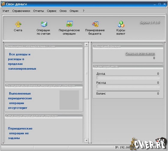 Own Money - программа, представляющая из себя систему для учета персональных финансов. Глубокая проработка и продуманность реализации в данной системе особенностей учета семейного бюджета, позволяет с гордостью говорить о ней, как о лучшей в своем классе. Когда вам нужно спланировать свой бюджет, не берите больше в руки бумагу и ручку. Делайте это с помощью удобного, современного инструмента - компьютера. Просто и наглядно представленная информация о ваших финансах поможет вам объективно оценить ваше текущее финансовое положение. Продвинутая система планирования бюджета предоставит Вам возможность сделать прогноз на будущее. Контроль за исполнением запланированного бюджета возьмет на себя компьютер.