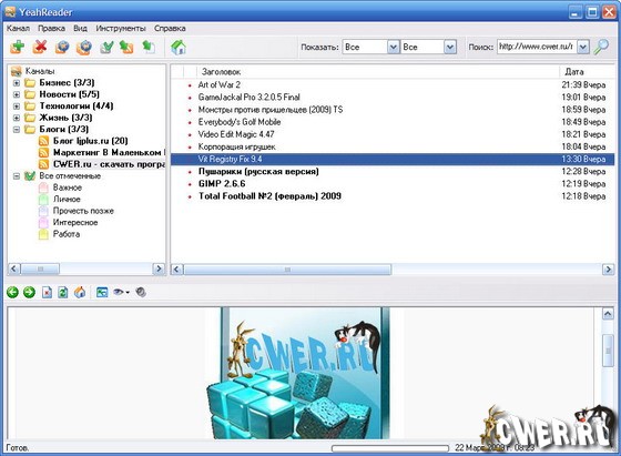 Также, YeahReader – это одна из самых простейших в использовании программ чтения новостей. Данная программа содержит коллекцию ссылок к популярным механизмам подачи RSS по различным темам, так что вам не придется тратить деньги в поисках интересных ссылок.