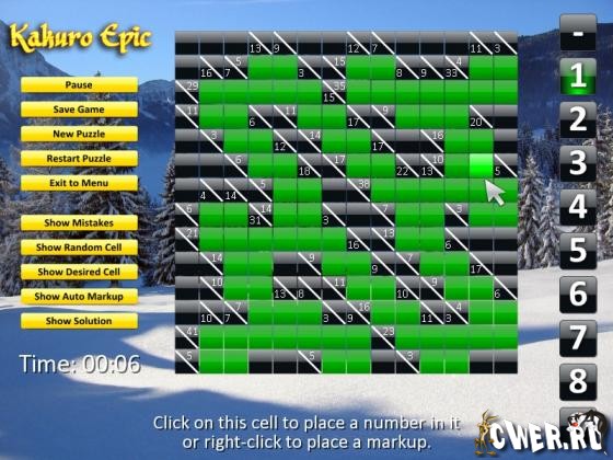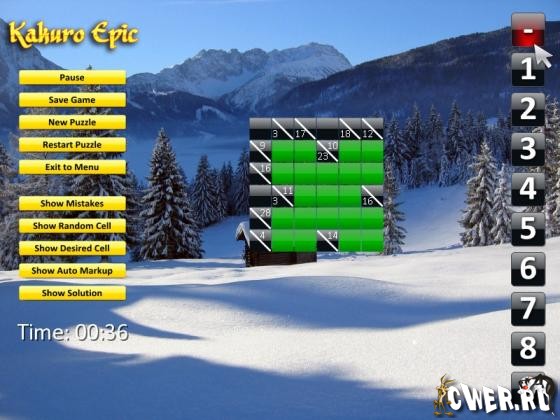 Какуро - головоломка с числами, которую можно назвать математическим аналогом кроссворда. Поле состоит из клеток черного и белого цвета. Несколько белых клеток, идущих подряд по горизонтали или по вертикали, называются блоком. Про каждый блок известна сумма цифр, которые должны стоять в этом блоке.