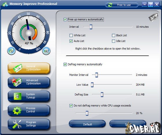 Windows позволяет использование множества запущенных программ одновременно. Это совсем не плохо для пользователя, когда несколько инструментов работают в фоновом режиме и оказывают ему разные полезные услуги. Но запущенные одновременно процессы сильно фрагментируют оперативную память, что приводит к столпотворению элементов программ и, как следствие, сильно замедляет работу системы, а то и вовсе приводит к её «зависанию». Memory Improve Professional – это один из полезных инструментов, который в информативной форме в виде прибора показывает текущее состояние потребления памяти и может автоматически или вручную производить дефрагментацию и освобождать для вас ресурсы в виде дополнительной памяти. Это в целом улучшит работу системы, уменьшит время её загрузки и повысит её производительность.
