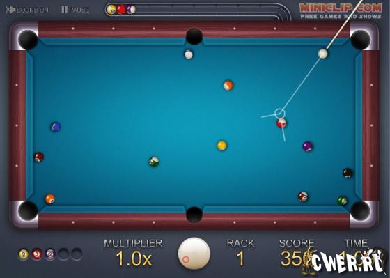 Весьма неплохо реализованная во флеше игра в пул. Имеется возможность подкручивания битка. Игра ограничена по времени, но при попадании в лузы пяти шаров подряд, время увеличивается, а при попадании битка, наоборот уменьшается. После достижения пятого уровня, появляется функция отключения подсказки.