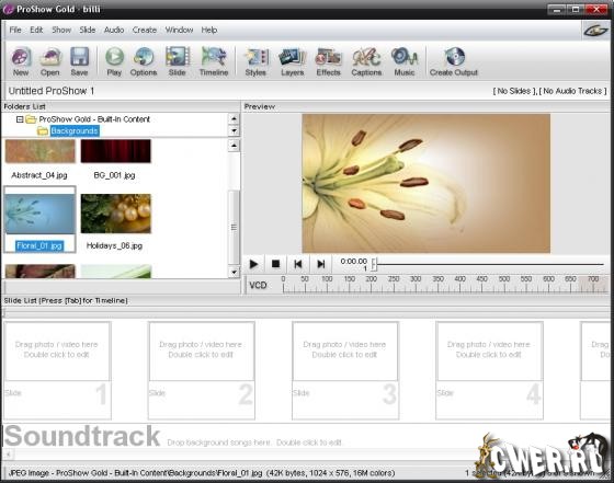 С одной стороны, ProShow Gold - программа очень простая в применении (поддерживается drag-and-drop), с другой - обладает множеством полезных возможностей, начиная с автоматической синхронизации времени проигрывания музыкального сопровождения со временем показа слайд-шоу до очень удобной записи созданного проекта на DVD и VCD.