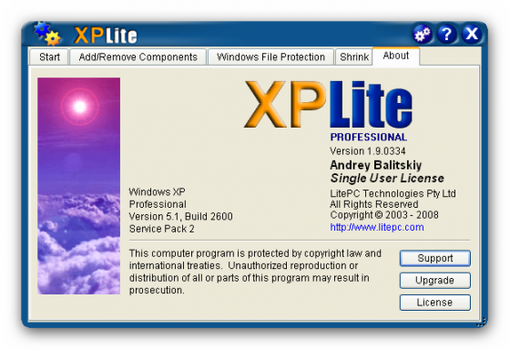 XPlite — это очень мощная программа, предназначенная для удаления множества ненужных компонентов из Windows XP и Windows 2000. XPLite позволяет удалить компоненты операционной системы, которые обычными средствами удалить невозможно. В первую очередь можно отметить удаление совершенно ненужных рисунков, заставок, указателей мыши, обоев рабочего стола и прочей чепухи. Без проблем можно полностью удалить из системы встроенный Outlook Express, адресную книгу, Windows Messenger а также всяческие чаты и NetMeeting'и. Чтобы удалить ненужный компонент достаточно снять с него галочку и нажать кнопочку Next. Программа создаст контрольную точку восстановления и удалит всё, что вы ей скажете. Так же легко можно впоследствии заново установить удалённый компонент.