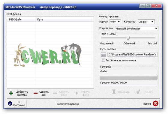 MIDI to WAV Renderer позволяет быстро и эффективно конвертировать файлы, убирая иностранные звуки. MIDI to WAV Renderer преобразовывает файлы MIDI в WAV легко и быстро, в 100 % цифровом качестве, исключая оригинальные посторонние звуки во время процесса преобразования. Если вам нужно преобразовать MIDI-файл в WAV-формат, MP3, основная проблема, с которой Вы столкнуться являются иностранным звуки, которые попадают в выходной звуковой файл. Иностранные звуки вызваны фоновой музыкой, эффектами и различные шумами, которые воспроизводит компьютер через звуковую плату, которую большинство аудио-конвертеров используют для конвертирования аудио файлов из одного формата в другой.