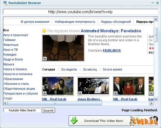YoutubeGet - очень простой, но в то же время очень удобный набор инструментов для: просмотра, скачивания и конвертации изображения с популярного сайта Youtube.com . Программа имеет свой встроенный браузер, интуитивно понятную качалку и конвертер, который поможет перекодировать полученный файл в нужное разрешение и формат для дальнейшего просмотра его на компьютере, мобильнике или других устройствах.