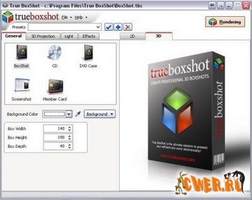 True-BoxShot - программа для создания трехмерных графических изображений коробок для софта, клубных карт, компакт-дисков, DVD-коробочек. Очень простой интерфейс, много настроек и эффектов, высокое качество готового изображения.