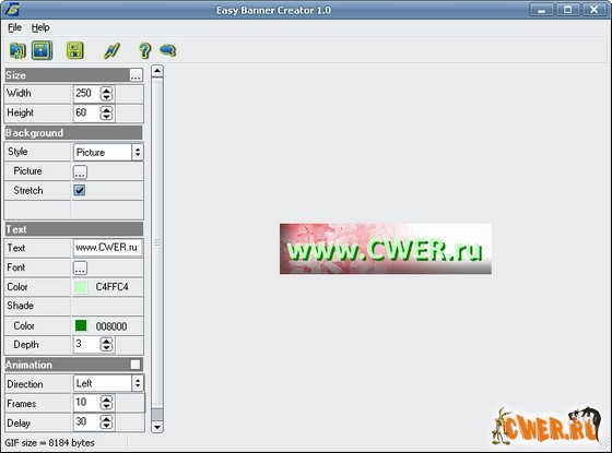 Позволяет вам быстро и просто создать анимированные баннеры для вашего веб сайта. Данная программа позволяет создавать баннеры самым простым способом. Вы выбираете первую композицию текста и элементы изображений, потом вы настраиваете данный текст и изображения, выбираете фон и границы баннера и потом настраиваете анимацию. Более того, EasyBanner имеет примеры баннеров, фоновых шаблонов, маленькую библиотеку изображений и специальных эффектов. Для того чтобы установить баннер на ваш сайт, программа использует функцию экспорта GIF.