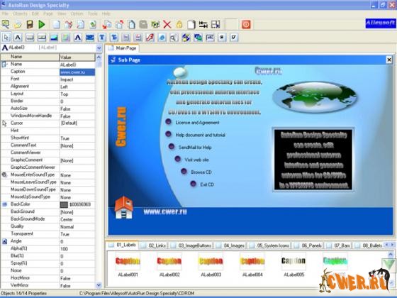 AutoRun Design Specialtyis - программа для создания меню автозапуска диска. Содержит удобные инструменты для создания оригинального индивидуального меню. Есть возможность добавлять различные элементы, такие как страница лицензионного соглашения, заставка, появляющаяся при вставке диска в привод, окно, сопровождающее закрытие меню и т. д. Программа дает возможность создавать меню с неограниченным числом страниц, а также использовать в нем кнопки, графические файлы, текст, Flash-ролики, видеофайлы. Программа содержит большую библиотеку кнопок, иконок, разделителей, фоновых изображений и других неотъемлемых элементов меню, имеется возможность использования произвольного графического файла в качестве текстуры для кнопок, а также внедрение в оболочку медиапрогрывателя, с помощью которого может выполняться просмотр фильмов, записанных на диске.