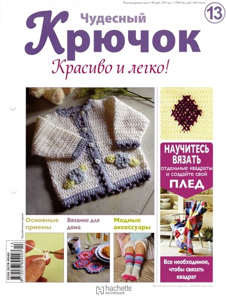 Коллекция «Чудесный крючок. Красиво и легко!» — это простой и доступный способ освоить искусство вязания крючком. С каждым номером вы сможете научиться различным способам вязания крючком, а также познакомитесь с новым узором, выполнение которого представлено пошагово с помощью простых объяснений и фотографий. В каждом выпуске предлагаются прекрасные модели для вас и вашего дома. Откройте в себе талант и познайте радость творчества! Регулярно получая описания простых в исполнении моделей, вы соберете собственную коллекцию.
