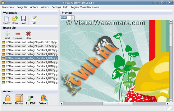 Visual Watermark - программа для защиты изображений самым быстрым и надежным способом - при помощи внедрения видимого клейма в картинки, т.е. "водяного знака". Visual Watermark может в пакетном режиме наносить на изображения "водяные знаки", добавлять к ним различные эффекты: тень, градиенты, контуры и многое другое. Позволяет также создавать "водяные знаки" из графики, текста, редактировать их и сохранять для дальнейшего использования.