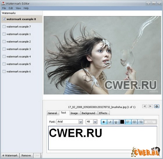 Watermark Master - предназначена для добавления водяных знаков на графику и видео. В качестве водяного знака программа позволяет использовать текстовую надпись, изображение, анимированный файл GIF, видеоклип, различные векторные фигуры.