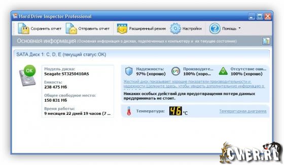 CrystalDiskInfo - отслеживает состояние жестких дисков, поддерживающих технологию S.M.A.R.T. Производит мониторинг и дает общую оценку "здоровья" вашего диска. Так же отображает детальную информацию о жестких дисках, установленных в компьютере (прошивка, серийный номер, стандарт, интерфейс, общее время работы и др.), а также выводит параметры атрибутов системы самодиагностики S.M.A.R.T. (ошибки чтения, производительность, запуски/остановки шпинделя, время поиска дорожки, количество циклов включения-выключения, ошибки секторов и многое другое).