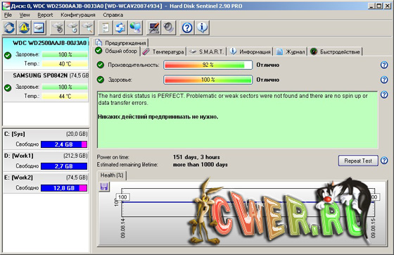 Hard Disk Sentinel - утилита для мониторинга и контроля состояния жестких дисков. Позволяет определить потенциальные проблемы, снижение производительности и возможные сбои. Может предупредить пользователя в случае обнаружения неполадок или превышения температуры.