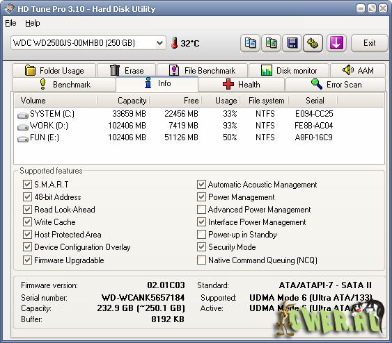 HD Tune - утилита, предназначенная для детального тестирования работоспособности и производительности жестких дисков с различными интерфейсами, а также карт памяти и flash-дисков. Программа контролирует и отображает в графическом формате такие параметры накопителей, как скорость передачи данных, время доступа, уровень загрузки процессора, температуру винчестера, показывает в виде сводной таблицы данные S.M.A.R.T, позволяет сканировать жесткие диски и другие устройства хранения информации на предмет наличия ошибок, выдает информацию о версии firmware, серийном номере, объеме диска и его кэша, возможном и активном режимах передачи данных и т.п.