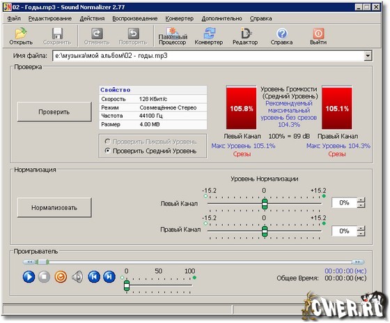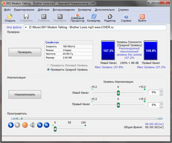 Что больше всего раздражает в музыке, так это недостаточная или избыточная громкость записанного трека. Sound Normalizer - звуковой нормализатор звука, предназначенный для повышения или восстановления уровня громкости музыкальных WAV и MP3 файлов, причем отдельно по каждому каналу. Уровень громкости отображается в графическом виде с использованием процентного значения. WAV-нормализация выполняются по пиковому уровню(пиковая нормализация), а MP3-нормализация по стандарту Replay Gain. Алгоритм Replay Gain работает, используя психоакустический анализ обрабатываемого файла для определения воспринимаемого человеком уровня громкости. Replay Gain основан на среднеквадратическом анализе Root Mean Square(RMS) и сама MP3-нормализация производится по среднему уровню громкости(RMS нормализация). Эта программа проста в использовании и даёт быстрые и превосходные результаты качественного звука. Имеется возможность пакетной обработки.