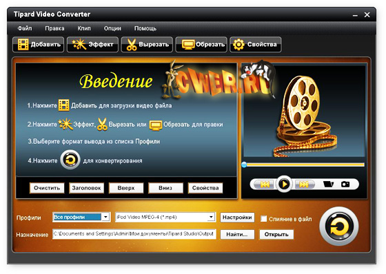 Tipard Video Converter -професиональный конвертер.Легко и просто конвертит почти все форматы видео (видео высокого разрешения High Definition video files(HD/AVCHD videos)MPG, MPEG, MPEG2, SWF, FLV, VOB, MOD, MP4, H.264, M4V, AVI, WMV, 3GP, 3GPP, MOV, DivX, XviD, Quciktime Video, DV, MJPG, MJPEG, MPV).Кроме этого упакован профессиональным программным обеспечением для перекодировки любого аудио формата без потери качества, а встроенный редактор позволяет вырезать аудио фрагменты из видео и конвертировать в самые популярные форматы, такие как M4A, MP3, AC3, AAC, WMA, WAV, OGG, AU, Nut, AIFF, FLAC, AMR. Перекодированные файлы совместимы с iPod, iPhone, Apple TV, PSP, PS3, Wii, Zune, Xbox, Sony Walkman, Sony XPERIA, Google Phone, BlackBerry и с другими мобильными телефонами.